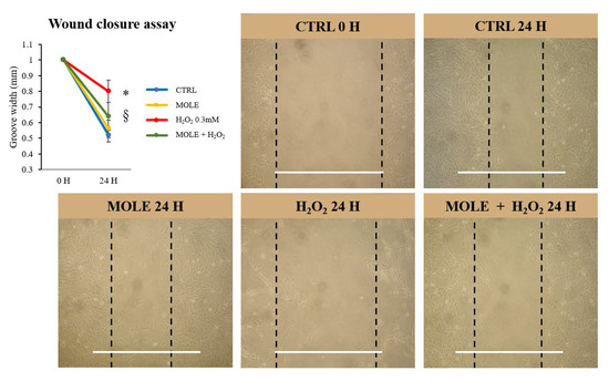 After 24 h, reductions in wound width of 48% and 44% were observed for the CTRL and MOLE samples, respectively (Figure 4). After a single 24 h H2O2 treatment, a minor reduction was observed compared to the control (20% reduction, p < 0.05).