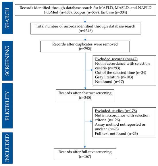 A PRISMA flow diagram detailing the search and selection process for the present systematic review is reported in Figure 1. A total of 1346 articles were found in PubMed, Embase, and Scopus databases. In particular, 23 articles for MAFLD or MASLD query and 430 for NAFLD were found using the PubMed search engine; 24 articles for MAFLD or MASLD and 310 for NAFLD were found using the Embase search engine, and 45 articles for MAFLD or MASLD and 514 for NAFLD were found using Scopus’ search engine). Search results were imported into JabRef for further management [].