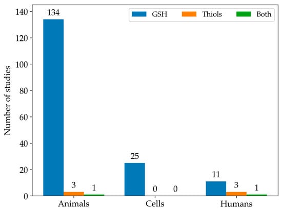All selected articles were initially categorised into three sections, depending on whether the study design included animal, cell models, or human fluids (tissue/plasma/serum/blood), and summarised in tables in chronological order. Next, the articles were divided into two macro areas depending on whether the molecule of interest was all forms of GSH or other LMW thiols (i.e., Cys, CysGly, and Hcy). Overall, Section 3.3, Section 3.4 and Section 3.5, as well as the included tables, described studies performed in animal models, cell models, and humans, respectively. Rats and mice studies that did not report explicit data and studies using other animals were included in Supplementary Tables.