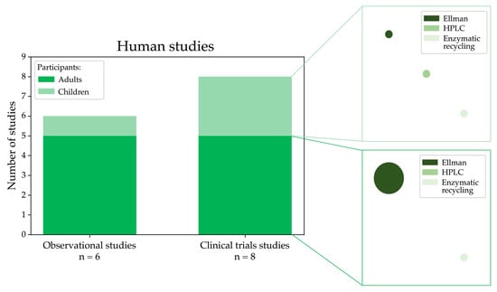 In human studies, study type, age, number of subjects, assay methods, measurements, and statistical significance of the amount of GSH (GSH, tGSH, and GSSG) and thiols (Cys, CysGly, and Hcy) were captured.