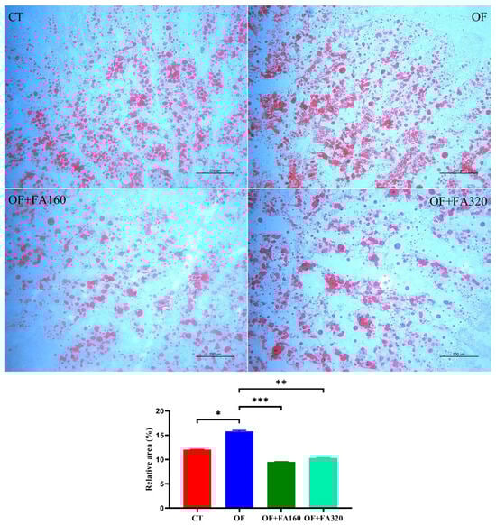 Figure 2 shows the results of Oil Red O staining. Compared with the CT group, the proportion of lipid droplets in the hepatopancreas of the OF group increased significantly (p < 0.05). The OF+FA160 and OF+FA320 groups significantly reduced the relative content of lipid droplets compared to the OF group (p < 0.05).