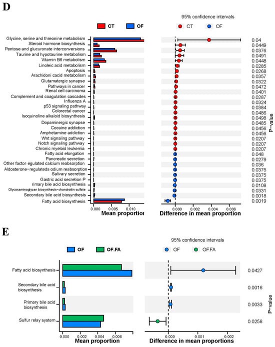 Effect of dietary oxidized fish oil with ferulic acid supplementation on gut microbiota function of M. nipponense. CT: control group; OF: 3% oxidized fish oil; FA: ferulic acid. (A): Classification of level 2 functional forecasts and their proportion of level 1 functional forecasts; (B,C): functional forecasts analysis on level 2 between CT and OF groups, as well as between the OF and OF.FA groups; (D,E): functional forecasts analysis between CT and OF groups, as well as between the OF and OF.FA groups at level 3. The middle showed the difference between the proportions of functional abundance in the 95% confidence interval (p < 0.05). The value at the rightmost part of the figure is the p-value. p < 0.05 represents a significant difference.