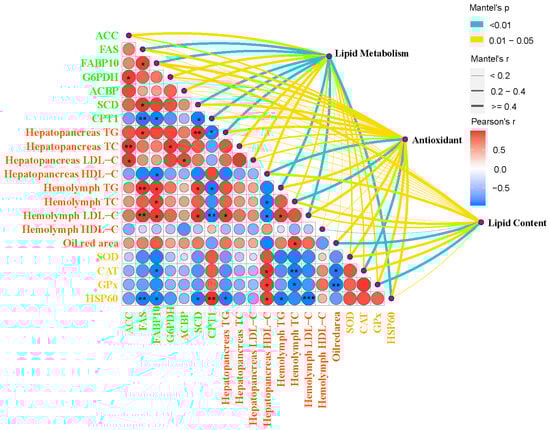 The analysis presented in Figure 7 explores the association between antioxidant capacity and lipid metabolism. The hepatopancreas TG was negatively correlated with FAS (p < 0.05) and SCD (p < 0.01). Additionally, the TC in the hepatopancreas was positively correlated with ACC (p < 0.01) and G6PDH (p < 0.05). The ACC and SCD were negatively correlated with hepatopancreas LDL-C (p < 0.05). The hemolymph TG and hemolymph LDL-C were positively correlated with FAS (p < 0.01), FABP10 (p < 0.05), and SCD (p < 0.05) and were negatively correlated with CPT1 (p < 0.05). The Oil Red area was positively correlated with hemolymph TC (p < 0.05) and was negatively correlated with hemolymph CAT (p < 0.05) and GPx (p < 0.05).