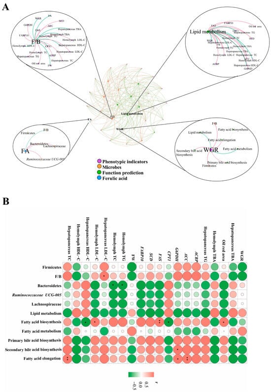 Correlation analysis of FA, microbes, function prediction, and phenotypic indicators in M. nipponense fed ferulic acid with oxidized fish oil. Note: (A): Correlation network analysis of FA, microbes, function prediction, and phenotypic indicators. The colors of the nodes indicate data types, and the colors of the lines indicate positive (red) or negative (green) correlation relationships. (B): Heatmap of Pearson’s correlations between phenotypic indicators, microbes, and function prediction. The colors range from green (negative correlations) to orange (positive correlations). Significant correlations are noted by * p < 0.05, and ** p < 0.01.WGR: weight gain rate; ACBP: acyl-CoA binding protein; ACC: acetyl CoA carboxylase; G6PDH: glucose-6-phosphate dehydrogenase; CPT1: carnitine palmitoyl-transferase 1; FAS: fatty acid synthase; SCD: stearoyl-CoA desaturase; FW: final weight; F/B: Firmicutes/Bacteroidetes.