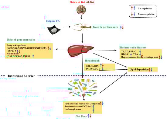 The hemolymph biochemical parameters of aquatic animals species were crucial components in assessing the nutritional and health status of the organism []. The concentration of TCHO and TG serves as a crucial indicator suggesting modifications in lipid metabolism []. LDL-C and HDL-C are important lipoproteins that contain abundant cholesterol; LDL-C is used to transport cholesterol molecules from the liver throughout the body. Excess amounts of oxidized low-density lipoproteins trigger the accumulation of cholesterol in arterial walls, leading to arterial hardening, while HDL-C facilitates the movement of cholesterol from the surrounding tissues to the liver, ultimately promoting cholesterol metabolism []. The results of this study showed that after adding OF to the diet, TG, TC, and LDL-C increased in the hemolymph of the OF group, but after adding 160 mg/kg FA to the diet of OF, the TG, TC, and LDL-C decreased significantly, while HDL-C showed the opposite results. This result may be attributed to the fact that OF leads to lipid metabolism disorders, which can be alleviated by adding a certain amount of FA. FA can scavenge some of the lipid peroxides produced by OF and alleviate lipid metabolism disorders by regulating the expression of enzymes and inducing the expression of these antioxidant enzymes. As a result, there is an increase in TG, TC, and LDL-C levels, while HDL-C levels in the hemolymph decrease. These results are consistent with a previous study on tilapia (O. mossambicus) by Yu [] and suggest that lipid metabolism disorders may be present in the oxidized fish oil-treated groups. In the OF+FA160 group, a significantly increased reduction in LDL-C and an increase in HDL-C was observed, underlining the positive influence of FA on lipid metabolism. The accumulation of certain bile acids in the liver that have hepatotoxic effects is balanced by others that have protective properties against liver lipid deposits and inflammation []. In addition to suppressing the biosynthesis of fatty acids and triglycerides, bile acids can also activate the elimination of triglycerides from serum by stimulating lipoprotein lipase and causing the hydrolysis of triglycerides in VLDL and chylomicrons []. Our study found that the levels of hemolymph and hepatopancreatic TBA were noticeably higher in the OF+FA160 group compared to the OF group. Considering the lipid content of the samples, these results suggest that FA reduces lipid accumulation by increasing TBA concentration.