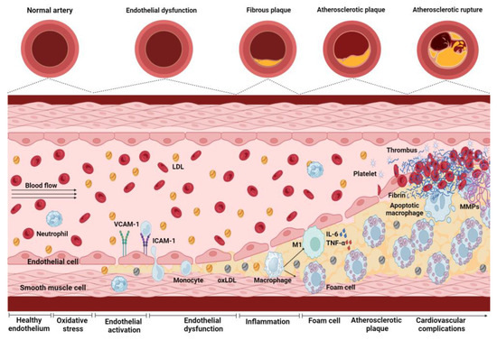 Endothelial dysfunction process and its progression toward atherosclerotic plaque development. Blood vessels are initially present in a healthy endothelium, but endothelial activation (EA) occurs under oxidative stress conditions. EA increases the expression of adhesion molecules, such as vascular cell adhesion molecule 1 (VCAM-1) and intercellular adhesion molecule 1 (ICAM-1), favoring the adhesion and migration of monocytes to the endothelium, contributing, in turn, to the onset of endothelial dysfunction (ED). In ED, the epithelium loses its ability as a selective barrier, increasing vascular permeability and allowing the passage of low-density lipoproteins (LDLs). Once inside the arterial wall, LDL is oxidized, forming ox-LDL. The monocytes migrate to the endothelium and differentiate into macrophages, phagocytizing ox-LDL and becoming foam cells. Simultaneously, M1-type activated macrophages release pro-inflammatory cytokines, such as interleukin (IL) 6 (IL-6) and tumor necrosis factor-alpha (TNF-α), amplifying the inflammatory response at the site of tissue damage. This process is carried out by macrophages, T-cells, natural killer cells, and dendritic cells that contribute to sustained local inflammation and neutrophils that contribute to superficial erosion and fibrous cap rupture. This process contributes to the accumulation of foam cells and the formation of atherosclerotic plaque. Additionally, the activated macrophages secrete matrix metalloproteinases (MMPs), which degrade the extracellular matrix, weakening the atherosclerotic plaque and making it more vulnerable to rupture, increasing the risk of cardiovascular complications. The image was created with BioRender (https://www.biorender.com/ (accessed on 12 September 2024)).