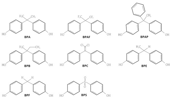 Bisphenols’ chemical structures. Bisphenol A (BPA), bisphenol AF (BPAF), bisphenol AP (BPAP), bisphenol B (BPB), bisphenol C (BPC), bisphenol E (BPE), bisphenol F (BPF), and bisphenol S (BPS).