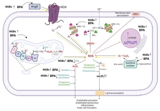 Oxidative stress stimuli are generated by CVD’s concurrent conditions, such as diabetes, metabolic syndrome, obesity, hypercholesterolemia, hypertension, alterations in the renin–angiotensin-II (AngII) system, and inflammation. Such alterations lead to reactive oxygen species (ROS) decreasing the bioavailability of (NO•−), a hallmark of vascular EA and a predictive factor of CVD events [17]. Additionally, exposure to xenobiotics, such as bisphenols (BPs), has been related to oxidative stress production, being a possible provider of CVD development as well as other pathologies such as cancer and interstitial lung, kidney, and reproductive dysregulation.