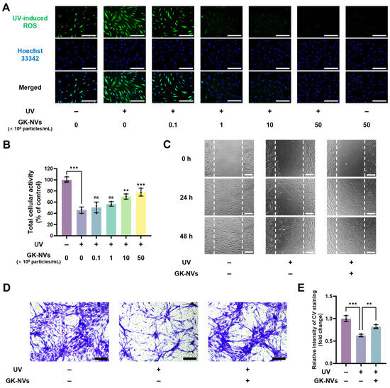 3.3. GK-NVs Attenuate UV-Induced Oxidative Stress and the Consequent Decline in Proliferative and Migratory Capacities of BM-MSCs