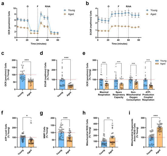 Evaluation of mitochondrial bioenergetics and ROS levels in young and aged iPSC-derived neurons. Changes over time in (a) OCR and (b) ECAR of young and aged neurons were measured simultaneously by the sequential addition of specific respiratory modulators. Quantification of (c) OCR and (d) ECAR under basal conditions in young and aged neurons from (a,b), respectively. (e) Respiratory parameters of young and aged neurons extracted from (a), specifically, maximal respiration, spare respiratory capacity, non-mitochondrial oxygen consumption, and ATP-production coupled respiration. Determination of (f) relative ATP levels and (g) MMP in young and aged neurons. Assessment of (h) total mitochondrial ROS levels and (i) O2•− levels in young and aged neurons. Data represent the mean ± SEM of N = 3 independent experiments with n = 2 replicates per donor for (a–e) and n = 3 replicates per donor for (f–i). Values were normalized on the quantified CellTracker signal and are shown as the percentage of the young neurons for (c–i). Student’s unpaired t-test young versus aged, * p < 0.05, ** p < 0.01, *** p < 0.001. AA: antimycin A; ATP: adenosine triphosphate; ECAR: extracellular acidification rate; F: carbonyl cyanide-p-trifluoromethoxyphenylhydrazone (FCCP); MMP: mitochondrial membrane potential; O: oligomycin; OCR: oxygen consumption rate; O2•−: mitochondrial superoxide anion radical; ROS: reactive oxygen species; R: rotenone.