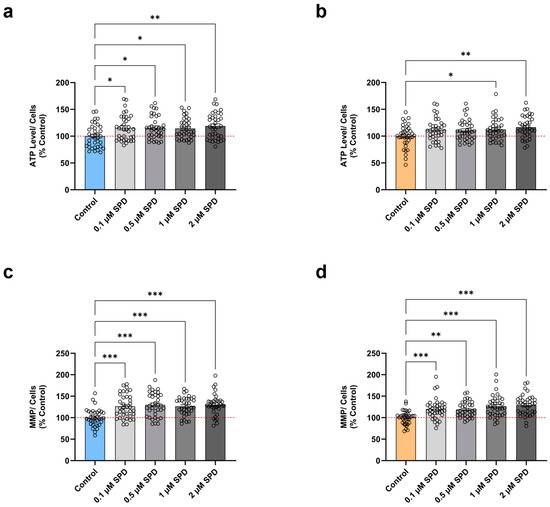 Concerning the effects of the various SPD concentrations on the MMP after the treatment for 48 h, young neurons (Figure 2c) presented a substantial augmentation in the MMP with all tested SPD concentrations compared to the untreated control. Comparatively, aged neurons (Figure 2d) treated with SPD versus the untreated control showed a pronounced elevation in the MMP for each SPD dose. Interestingly, SPD demonstrated an overall comparable efficacy in young and aged neurons. Moreover, for both groups, 2 µM SPD treatment proved to be the particularly effective dose again, resulting in an MMP increase of 30% in young and 29% in aged neurons.