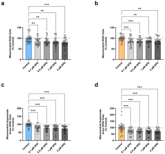 Further, previous findings reported that SPD was found to suppress oxidative stress in aging mice models [18,24]. Therefore, we subsequently explored the effects of different SPD concentrations (0.1 µM, 0.5 µM, 1 µM, 2 µM) on the total mitochondrial ROS levels (DHR) and the specific levels of O2•− (MitoSOX). After 48 h of treatment, we observed a dose-dependent reduction in total mitochondrial ROS levels in young neurons (Figure 3a) compared to the untreated control. Similarly, SPD induced a substantial attenuation in the total amount of mitochondrial ROS in aged neurons (Figure 3b) versus the untreated control. Of note, 2 µM SPD elicited the strongest decrement in young neurons with a lessening of 20%, while all tested SPD doses had the same beneficial effect in aged neurons with a decrease of 14%.