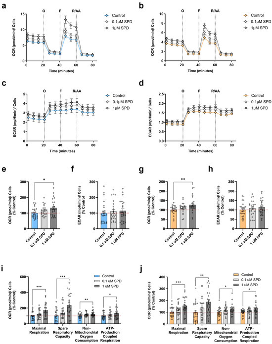 Regarding the calculated respiratory parameters after the injection of the specific inhibitors, the treatment with SPD for 48 h led in young neurons versus the untreated control (Figure 4i) to an enhancement of all metrics with 1 µM SPD, whereas 0.1 µM SPD elicited no marked effects, albeit demonstrating a tendency for an amendment, especially for the maximal respiration and the spare respiratory capacity. In particular, we found that 1 µM SPD most effectively elevated the maximal respiration by 74% and the spare respiratory capacity by 136%, while the beneficial impact on the non-mitochondrial oxygen consumption and the ATP-production coupled respiration was lower with an increase of 26% and 34%, respectively. Similarly, compared to the untreated control, all bioenergetic parameters were ameliorated in aged neurons (Figure 4j) after 48 h of treatment with 1 µM SPD, whereas 0.1 µM SPD showed no pronounced improvement, except for again presenting a tendency for an enhanced maximal respiration and spare respiratory capacity. Specifically, we observed that 1 µM SPD significantly augmented the maximal respiration, the spare respiratory capacity, the non-mitochondrial oxygen consumption, and the ATP production-coupled respiration by 55%, 88%, 26%, and 28%, respectively.
