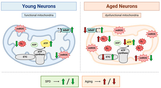 Schematic representation of the beneficial effects of spermidine on mitochondrial function in young and aged iPSC-derived neurons. Based on the findings obtained in the present study, the figure illustrates the age-related impairments in neuronal mitochondria and the SPD-mediated ameliorations in mitochondrial function for young and aged neurons. Red arrows indicate an increase or decrease in the depicted parameters for aged neurons, while green arrows denote an SPD-evoked amelioration or attenuation in the displayed parameters for young and aged neurons. ADP: adenosine diphosphate; ATP: adenosine triphosphate; ETC: electron transport chain; MMP: mitochondrial membrane potential; mtROS: mitochondrial reactive oxygen species; O2•−: mitochondrial superoxide anion radical; SPD: spermidine. Created with BioRender.com (accessed on 25 February 2023).
