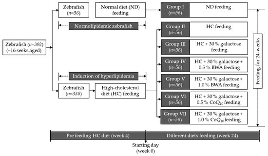 Adult zebrafish (~18 weeks, n = 392) were randomly segregated and maintained with a normal diet (ND, n = 56) and a high-cholesterol diet (HC, n = 336). Following four weeks of consumption, the ND-fed zebrafish (Group I) were further maintained only on the ND diet for the next 24 weeks, while the HC-fed zebrafish were further segregated into five groups (n = 56/group). The zebrafish in Group II were maintained in the HC diet only, while the zebrafish in Groups III and IV were fed with HC+Gal+0.5% BWA and HC+Gal+1.0% BWA, respectively. The zebrafish in Groups V and VI were fed with HC+Gal+0.5% CoQ10 and HC+Gal+1.0% CoQ10, respectively. The experimental layout involves feeding zebrafish with different diets is depicted in Figure 1. The zebrafish in the different groups (I–VI) were fed the designated diet (10 mg/zebrafish) twice a day (morning and evening) until 24 weeks. The food consumption was measured by using the following formula: [(given food amount − remaining food amount)/given food amount] × 100. The feed efficiency was quantified by measuring the feed conversion ratio using the following equation: [weight gain (g)/feed consumed (g)] × 100. The feed efficiency was calculated at 24 weeks of consumption of the respective diets.