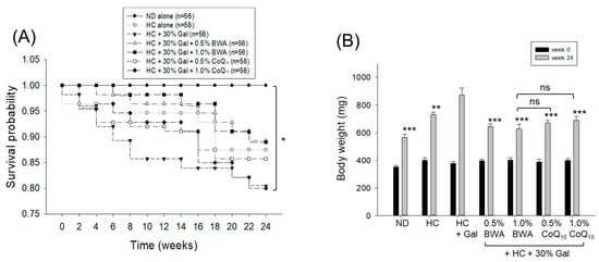 Zebrafish survivability and body weight across the different groups. (A) Survival probability across different groups during 24 weeks of consumption of the respective diets. The Kaplan–Meier survival analysis followed by log-rank test was used to determine the statistical difference in the survival probability curve. *, p < 0.05 (log-rank: χ2 = 13.5). (B) Body weight of zebrafish at the beginning (week 0) and after 24 weeks of consumption of the different diets. ND represents the normal diet; HC represents the high-cholesterol (final 4%, w/w) diet; HC+Gal represents the high-cholesterol (final 4%, w/w) with galactose (final 30%, w/w) diet; and HC+Gal+BWA (0.5%/1.0%) or CoQ10 (0.5%/1.0%) represents the high-cholesterol + galactose diet supplemented with beeswax alcohol (final 0.5% or 1.0% w/w) or coenzyme Q10 (final 0.5% or 1.0% w/w), respectively. ** (p < 0.01) and *** (p < 0.001) depict the statistical difference in the body weight measured at 24 weeks of consumption of different diets with respect to the HC+Gal group. “ns” represents the non-significant difference between the specified group concerning the HC+Gal+1.0% BWA group.