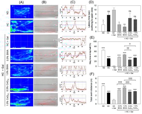A representative image of the swimming trajectories and swimming behavior of zebrafish across different groups. (A) Heat map of zebrafish swimming trajectory for 60 s following 22 weeks consumption of different diets. (B) Swimming trajectory of zebrafish motion (60 s) across different groups after 24 weeks of consumption of different diets. (C) The vertical movement trajectories of zebrafish across different groups. The blue dotted line inside the images represents the middle line segregating the upper and lower halves of the water tank. (D) The latency time of movement (represents the average time zebrafish took to transition from the lower to the upper half) in 60 s. (E) Time of stay in the top half of the tank and (F) total swimming distance during 60 s. ND represents the normal diet; HC represents the high-cholesterol (final 4%, w/w) diet; HC+Gal represents the high-cholesterol (final 4%, w/w) with galactose (final 30%, w/w) diet; and HC+Gal+BWA (0.5%/1.0%) or CoQ10 (0.5%/1.0%) represents the high-cholesterol + galactose diet supplemented with beeswax alcohol (final 0.5% or 1.0% w/w) or coenzyme Q10 (final 0.5% or 1.0% w/w), respectively. * (p < 0.01), ** (p < 0.01) and *** (p < 0.001) depict the statistical difference with respect to the HC+Gal group, while † (p < 0.05), †† (p < 0.01), and ††† (p < 0.01) depict the statistical difference with respect to the HC+Gal+1.0% BWA group. “ns” represents the non-significant difference between the specified group concerning the HC+Gal group.