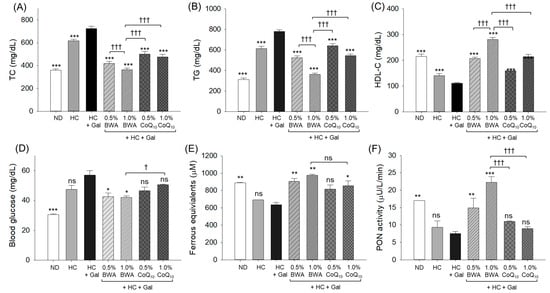 As shown in Figure 4A,B, the ND group showed the lowest plasma TC and TG levels, while the HC group showed 1.7-fold and 2.0-fold elevations in TC and TG levels to those of the ND group. Furthermore, the HC+Gal group showed the highest TC and TG levels, which were significantly, 2.0- (p < 0.001) and 2.5-fold (p < 0.001), higher than in the ND group and 1.2- (p < 0.001) and 1.3-fold (p < 0.001) higher than in the HC group. However, the co-consumption of BWA resulted in a remarkable decrease in TC and TG levels; the 1.0% BWA group showed the lowest levels of TC and TG, i.e., 50% and 54% less than the HC+Gal group. Similarly, the CoQ10 displayed 31–35% less TC and 18–30% lower TG levels than the HC+Gal group.
