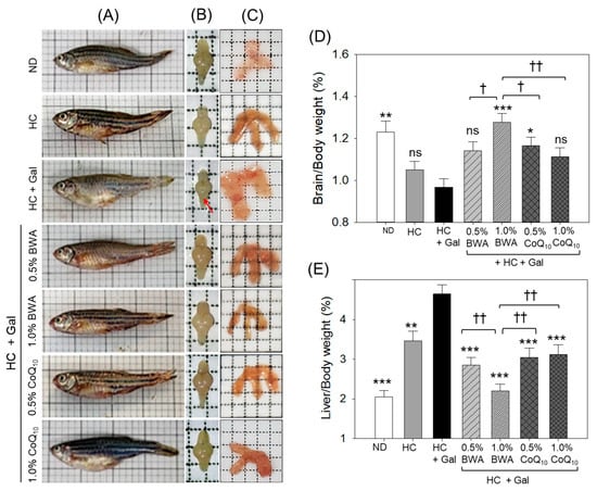 Pictorial view of representative morphological images of (A) zebrafish and (B) whole brain, with the red arrow depicting shrinkage of the cerebellum of the brain; (C) liver segregated from the different groups at 24 weeks of consumption of the designated diets. Percentage average weight (n = 15) of (D) brain and (E) liver with respect to body weight across the different groups consuming specified diets. ND represents the normal diet; HC represents the high-cholesterol (final 4%, w/w) diet; HC+Gal represents the high-cholesterol (final 4%, w/w) with galactose (final 30%, w/w) diet; and HC+Gal+BWA (0.5%/1.0%) or CoQ10 (0.5%/1.0%) represents the high-cholesterol + galactose diet supplemented with beeswax alcohol (final 0.5% or 1.0% w/w) or coenzyme Q10 (final 0.5% or 1.0% w/w), respectively. * (p < 0.01), ** (p < 0.01), and *** (p < 0.001) depict the statistical difference with respect to the HC+Gal group, while † (p < 0.05) and †† (p < 0.01) depict the statistical difference with respect to the HC+Gal+1.0% BWA group. “ns” represents the non-significant difference between the specified group concerning the HC+Gal group.
