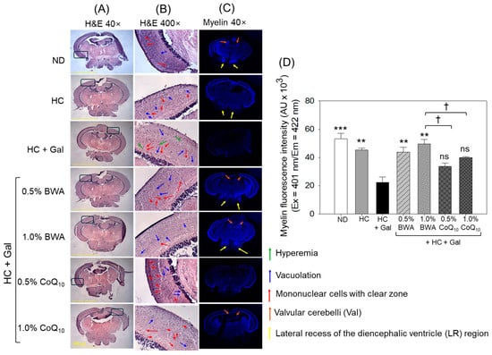 The immunohistochemical (IHC) staining revealed a ~15% lower myelin-specific fluorescent intensity in the HC-consumed group than in the ND group (Figure 6C,D). Particularly, substantial demyelination was noticed around the valvular cerebella (Val) (indicated by a brown arrow) and in the lateral recess of the diencephalic ventricle (LR) region of the brain section (indicated by a yellow arrow). The consumption of HC+Gal displayed a severe decline in myelin-specific fluorescent intensity, which was substantially, 2.4-fold (p < 0.001) and 2.0-fold (p < 0.01), lower than the fluorescent intensity observed in the control and HC groups, respectively, suggesting an adverse effect of HC+Gal on the myelin sheath. BWA consumption significantly prevents HC+Gal-induced demyelination, reflected by ~2.2-fold (p < 0.01) and 2.0-fold (p < 0.01) higher myelin-specific fluorescent intensity in the 0.5% and 1.0% BWA group than the fluorescent intensity observed in the HC+Gal group. Contrary to BWA, CoQ10 consumption displayed a non-significant effect in mitigating HC+Gal-provoked demyelination.