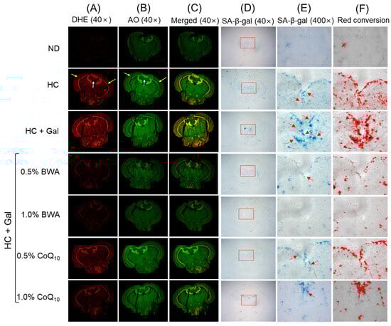 Fluorescent staining: (A) dihydroethidium (DHE), (B) acridine orange (AO), (C) merged images of DHE and AO captured at 40× magnification. (D) Cellular senescence-associated-β-galactose (SA-β-gal) staining at 40× magnification. (E) The 400× magnified images of the SA-β-gal-stained section inside the red box (as mentioned in (D)). The yellow arrow represents the periventricular gray zone of the optic tectum. The white arrow depicts the valvular cerebelli while the red arrow highlights the SA-β-gal positive cells around the vascular lacuna of the postrema and below the tectal ventricle region. (F) Red conversion of the (400× magnified) blue-colored SA-β-gal-positive cells. The red conversion was performed with Image J software (version 1.53) at the blue color threshold value (0–120) to enhance the visibility of the SA-β-gal-stained area. (G) and (H) Quantification of DHE and AO fluorescent intensity, respectively. (I) Quantification of the SA-β-gal-stained area. ND represents the normal diet; HC represents the high-cholesterol (final 4%, w/w) diet; HC+Gal represents the high-cholesterol (final 4%, w/w) with galactose (final 30%, w/w) diet; and HC+Gal+BWA (0.5%/1.0%) or CoQ10 (0.5%/1.0%) represents the high-cholesterol + galactose diet supplemented with beeswax alcohol (final 0.5% or 1.0% w/w) or coenzyme Q10 (final 0.5% or 1.0% w/w), respectively. ** (p < 0.01) and *** (p < 0.001) depict the statistical difference with respect to the HC+Gal group, while † (p < 0.05) and ††† (p < 0.001) depict the statistical difference with respect to the HC+Gal+1.0% BWA group. “ns” represents the non-significant difference between the specified group concerning the HC+Gal group.