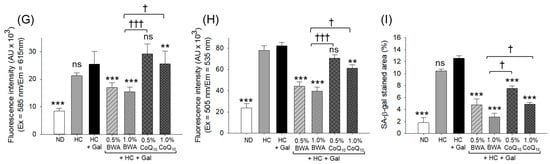 The SA-β-gal staining revealed higher senescence in the HC+Gal group that accounts for 64.8% SA-β-gal-positive cells, which was significantly 10-fold (p < 0.001) and 1.8-fold (p < 0.001) higher than the SA-β-gal-positive cells that occurred in the ND and HC-alone groups, respectively (Figure 9D,H). HC+Gal-induced cellular senescence was significantly prevented by the consumption of BWA, as reflected by the 5.5-fold (p < 0.001) and 6.1-fold (p < 0.001) lower SA-β-gal-positive cells in the hepatic section from the 0.5% and 1.0% BWA groups, respectively, compared to the HC+Gal group. Unlike BWA, the consumption of 1.0% CoQ10 displayed a non-significant effect in preventing HC+Gal-induced cellular senescence.