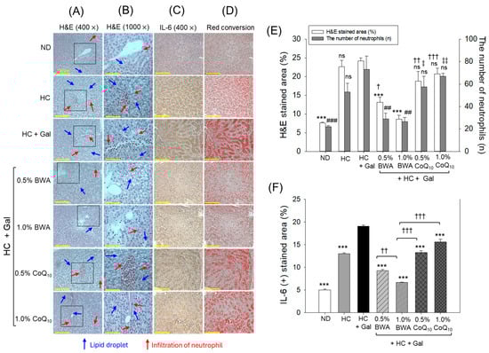 Hepatic histology of zebrafish across different groups consuming the specified diets for 24 weeks. (A) Hematoxylin and eosin (H&E) staining at 400× magnifications. (B) A 1000× magnified view of the H&E-stained section inside the black box (as mentioned in (A)). The red and blue arrows indicate neutrophil and lipid accumulation. (C) Interleukin (IL)-6-stained area examined by immunohistochemistry (IHC). (D) Brown-colored (IL-6 stained) area interchanged with red at the brown color threshold value 20–120 to enhance visibility. [Scale bar, 0.1 mm]. (E) Quantification of H&E-stained area and the number of neutrophils. (F) Percentage quantification of the IL-6-stained area. ND represents the normal diet; HC represents the high-cholesterol (final 4%, w/w) diet; HC+Gal represents the high-cholesterol (final 4%, w/w) with galactose (final 30%, w/w) diet; and HC+Gal+BWA (0.5%/1.0%) or CoQ10 (0.5%/1.0%) represents the high-cholesterol + galactose diet supplemented with beeswax alcohol (final 0.5% or 1.0% w/w) or coenzyme Q10 (final 0.5% or 1.0% w/w), respectively. *** (p < 0.001) (for H&E stained and IL-6-stained area), ## (p < 0.01), and ### (p < 0.001) (for neutrophil counts) depict the statistical difference with respect to the HC+Gal group. † (p < 0.05), †† (p < 0.01), and ††† (p < 0.001) (for H&E stained and IL-6-stained area), and ‡ (p < 0.05) and ‡‡ (p < 0.001) depict the statistical difference with respect to the HC+Gal+1.0% BWA group, respectively. “ns” represents the non-significant difference between the specified group concerning the HC+Gal group.