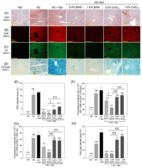 Evaluation of (A) oil red O (ORO) staining, (B,C) dihydroethidium (DHE) and acridine orange (AO) fluorescent staining, and (D) senescence associated-βgalactose (SA-β-gal) staining in hepatic tissue following 24 weeks of consumption of the specified diets. (E) Quantification of the ORO-stained area. (F) and (G) DHE and AO fluorescent intensity quantification, respectively. (H) Quantification of SA-β-gal-stained areas. ND represents the normal diet; HC represents the high-cholesterol (final 4%, w/w) diet; HC+Gal represents the high-cholesterol (final 4%, w/w) with galactose (final 30%, w/w) diet; and HC+Gal+BWA (0.5%/1.0%) or CoQ10 (0.5%/1.0%) represents the high-cholesterol+galactose diet supplemented with beeswax alcohol (final 0.5% or 1.0% w/w) or coenzyme Q10 (final 0.5% or 1.0% w/w), respectively. * (p < 0.05), ** (p < 0.01), and *** (p < 0.001) depict the statistical difference with respect to the HC+Gal group. † (p < 0.05) and ††† (p < 0.001) depict the statistical difference with respect to the HC+Gal+1.0% BWA group, respectively. “ns” represents the non-significant difference between the specified group concerning the HC+Gal group.