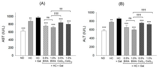 Plasma hepatic function biomarkers—(A) aspartate aminotransferase (AST) and (B) alanine aminotransferase (ALT)—in different groups consuming the specified diets for 24 weeks. ND represents the normal diet; HC represents the high-cholesterol (final 4%, w/w) diet; HC+Gal represents the high-cholesterol (final 4%, w/w) with galactose (final 30%, w/w) diet; and HC+Gal+BWA (0.5%/1.0%) or CoQ10 (0.5%/1.0%) represents the high-cholesterol + galactose diet supplemented with beeswax alcohol (final 0.5% or 1.0% w/w) or coenzyme Q10 (final 0.5% or 1.0% w/w), respectively. ** (p < 0.01) and *** (p < 0.001) depict the statistical difference with respect to the HC+Gal group, while †† (p < 0.01) and ††† (p < 0.001) depict the statistical difference with respect to the HC+Gal+1.0% BWA group. “ns” represents the non-significant difference between the specified group concerning the HC+Gal group.
