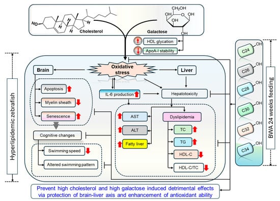 This 24-week consumption study displayed the remarkable functionality of BWA in preventing HC+Gal-induced adverse events in the blood, brain, and liver of zebrafish. Compared to CoQ10, BWA displayed a much higher effect in restoring HC+Gal-induced dyslipidemia and altered hepatic function biomarkers, blood glucose levels, and plasma FRA and PON activities. Also, a substantial effect of BWA was noticed in preventing myelin sheath degeneration in the brain and in restoring swimming behavior in zebrafish altered by the consumption of HC+Gal. The results outlined the functional superiority of BWA over COQ10 and endorsed its dietary supplementation to counter high-cholesterol and galactose-induced adverse events and the restoration of cognitive changes.