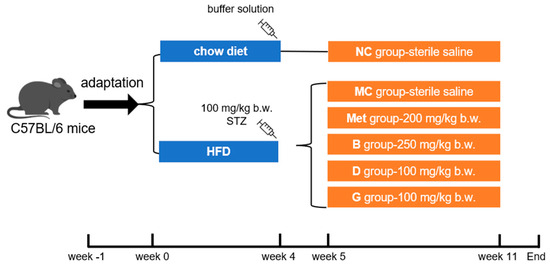 The male C57BL/6 mice (5 weeks old, 18–20 g) were purchased from Beijing Vital River Laboratory Animal Technology Co., Ltd. (Beijing, China). The mice were caged under standard conditions (12 h/12 h light–dark cycle, humidity at 50 ± 10%, temperature 22 ± 2 °C). Food and water were freely accessed. After adaptive feeding for 1 week, mice were randomly selected as the normal control group (NC group), fed a chow diet (Beijing Keao Xieli Feed Co., Ltd., Beijing, China). The remaining mice were provided with an HFD (#D12492, Research Diets, New Brunswick, NJ, USA). After 4 weeks, mice fed the HFD were intraperitoneally injected with STZ (100 mg/kg b.w., dissolved in a 0.1 M pH 4.5 citric acid/citrate buffer solution). After 1 week, fasting blood glucose (FBG) was measured, and mice with FBG higher than 11.1 mmol/L were considered as diabetic. Diabetic mice were randomly divided into 5 groups according to FBG level: model control (MC group), metformin positive medicinal control group (Met)—200 mg/kg b.w., blueberry polyphenol extract (B group) group—250 mg/kg b.w., dihydromyricetin (D group) group—100 mg/kg b.w. and gallic acid (G group) group—100 mg/kg b.w. The NC group and MC group were also given sterile saline. The mice were orally gavaged every day for 6 weeks. In the end, the liver, pancreas and serum of the mice were collected for further experiments. This process is shown in Figure 1.