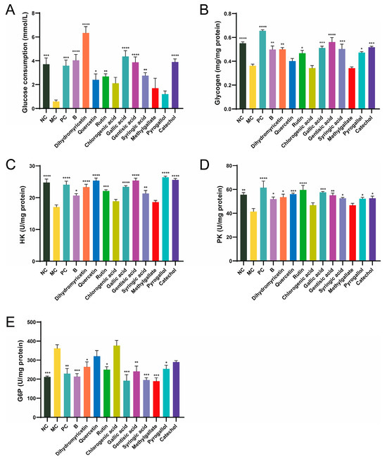 Effects of blueberry polyphenol in IR HepG2 cells. Blueberry extract was treated at 10 mg/L, and polyphenol compounds at 10 μM for 24 h. (A) Glucose consumption; (B) Glucose content; (C–E) Activity of HK, PK and G6P (n = 4). Data are expressed as the mean ± SEM. * p < 0.05 versus MC group; ** p < 0.01 versus MC group; *** p < 0.001 versus MC group; **** p < 0.0001 versus MC group.