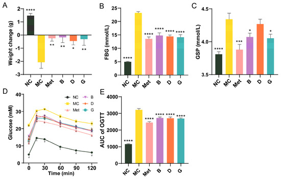 Effects of BPE on blood glucose levels in diabetic mice. (A) Weight change of mice after 6 weeks of treatment; (B) FBG; (C) GSP; (D) and (E) OGTT results of the mice (n = 6−8). Data are expressed as the mean ± SEM. * p < 0.05 versus MC group; ** p < 0.01 versus MC group; *** p < 0.001 versus MC group; **** p < 0.0001 versus MC group. The values with different letters (a, b, c or d) are significantly different (p < 0.05) between each group at the same time.