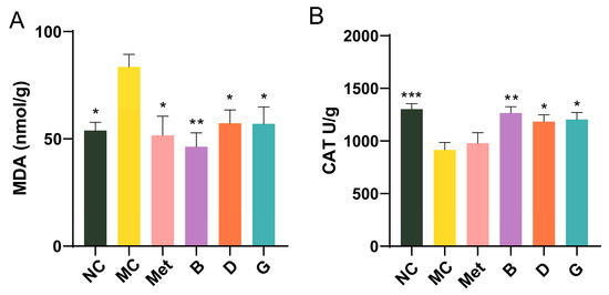 Oxidative stress is closely linked to the development of T2D. Malondialdehyde (MDA), a byproduct of lipid peroxidation, is commonly regarded as a biomarker for oxidative stress. Within the body’s metabolic processes, a substantial amount of reactive oxygen species (ROS) is generated, alongside the expression of antioxidant enzymes including catalase (CAT), which work to neutralize ROS and maintain cellular redox homeostasis. In the MC group, MDA levels were measured to be 1.55 times higher than those in the NC group, with CAT levels significantly reduced, reflecting severe oxidative stress in diabetic mice (Figure 6A,B). Intervention with BPE (groups B, D, G) significantly improved the MDA and CAT levels in the diabetic mice, suggesting that BPE may counteract the oxidative stress induced by hyperglycemia, thereby strengthening the organism’s resistance to oxidative damage.
