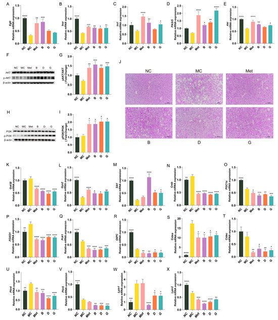 Effect of BPE on the expression of key genes of glucose metabolism and lipid metabolism in diabetic mice (n = 6). (A–E) Egfr, Insr, Irs1, Pik3r5, Akt mRNA expression; (F,H) Representative immunoblots of AKT, p-AKT, PI3K, p-PI3K in liver. (G,I) Quantification of protein levels of p-AKT/AKT and p-PI3K/PI3K (n = 4). (J) PAS staining of liver (200 × magnification, scale: 20 μm); (K–X) Gys2, GSK3β, Sik1, Creb, PGC-1α, FOXO1, PEPCK, G6Pase, Cidea, Cidec, Plin4, Plin5, Lpin1, Lpin2 mRNA expression (n = 6). Data are expressed as the mean ± SEM. * p < 0.05 versus MC group; ** p < 0.01 versus MC group; *** p < 0.001 versus MC group; **** p < 0.0001 versus MC group.
