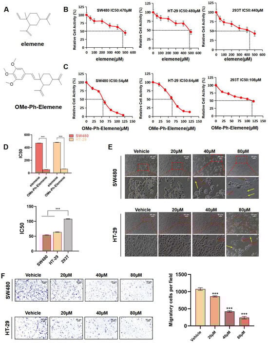 The inhibitory effect of OMe-Ph-Elemene on CRC cells was more potent compared to that of elemene. (A) The chemical structural formula of elemene and OMe-Ph-Elemene. (B) The SW480, HT-29, and 293T cells were subjected to treatment with elemene at concentrations ranging from 0 to 500 µM for a duration of 48 h. The relative cell viability was assessed using the cck8 kit, with each experimental group being replicated three times. (C) The SW480, HT-29, and 293T cells were exposed to OMe-Ph-Elemene at concentrations ranging from 0 to 120 µM for a duration of 48 h. The relative cell viability was assessed using the CCK-8 kit, with each experimental group replicated three times. (D) For SW480 and HT-29 cells, significant differences between the IC50 of elemene and OMe-Ph-Elemene were evaluated by a two-way t-test, *** p < 0.001. For SW480, HT-29, and 293T cells, significant differences between IC50 of OMe-Ph-Elemene were evaluated by one-way ANOVA analysis, *** p < 0.001. (E) The SW480 and HT-29 cells were treated with OMe-Ph-Elemene for 48 h. The morphological changes of the cells were observed using an inverted fluorescence microscope. Cell elongation was indicated by a red arrow, while cell shrinkage was indicated by a yellow arrow. (F) The migration of SW480 and HT-29 cells was assessed using a transwell assay following treatment with OMe-Ph-Elemene. After 24 h of exposure to various concentrations of OMe-Ph-Elemene, the number of cells that migrated across the membrane was quantified using crystal violet staining and visualized under an inverted microscope. *** p < 0.001. The vehicle groups represent solvent groups (DMSO).