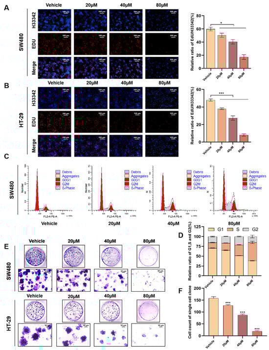 OMe-Ph-Elemene inhibited the proliferation of CRC cells by suppressing DNA synthesis. (A) SW480 cells treated with OMe-Ph-Elemene were stained with EDU and Hoechst 33342, and cell proliferation was observed with an inverted fluorescence microscope (EDU: red, Hoechst 33342: blue). * p < 0.05. (B) HT-29 cells treated with OMe-Ph-Elemene were stained with EDU and Hoechst 33342, and cell proliferation was observed with an inverted fluorescence microscope (EDU: red, Hoechst 33342: blue). *** p < 0.001. (C,D) SW480 cells treated with OMe-Ph-Elemene were stained with PI, and the cell cycle of the stained cells was detected by flow cytometry. The red peaks represented the G1 and G2 phases, and the cross regions represented the S phases. (E) SW480 and HT-29 cells were treated with different concentrations of OMe-Ph-Elemene for 12 days, and crystal violet-stained cell communities were observed by an inverted microscope. (F) A quantitative map of inhibition of OMe-Ph-Elemene on the clonal formation of SW480 cells. *** p < 0.001. The vehicle groups represent solvent groups (DMSO).