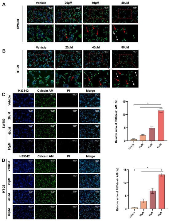 OMe-Ph-Elemene disrupted the integrity of cell membranes and induced death in CRC cells. (A) SW480 cells treated with OMe-Ph-Elemene were stained with Dio and Hoechst 33342, and the cell membrane showed green fluorescence, the nucleus showed blue fluorescence, the red arrow represented membrane damage, and the white arrow represented cell membrane debris. (B) HT-29 cells treated with OMe-Ph-Elemene were stained with Dio and Hoechst 33342, and the cell membrane showed green fluorescence, the nucleus showed blue fluorescence, the red arrow represented membrane damage, and the white arrow represented cell membrane debris. (C) SW480 cells treated with OMe-Ph-Elemene were stained with Hoechst 33342, Calcein AM, and PI, and the staining results were recorded by fluorescence inverted microscope (Hoechst 33342: blue, Calcein AM: green, PI: red) * p < 0.05. (D) HT-29 cells treated with OMe-Ph-Elemene were stained with Hoechst 33342, Calcein AM, and PI, and the staining results were recorded by fluorescence inverted microscope (Hoechst 33342: blue, Calcein AM: green, PI: red) * p < 0.05. The vehicle groups represent solvent groups (DMSO).