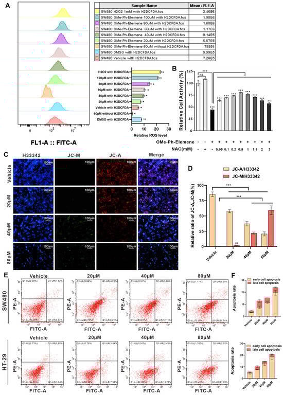 OMe-Ph-Elemene induced oxidative stress and promoted cell apoptosis. (A) SW480 cells treated with OMe-Ph-Elemene or H2O2 were incubated with 2µM H2DCFDA, and H2DCFDA-labeled cells were detected by flow cytometry. ns was not significant, * p < 0.05. The vehicle group serves as a negative control consisting solely of cells and H2DCFDA. (B) SW480 pretreated with 0–3 mM NAC was incubated with OMe-Ph-Elemene, and the cell activity was detected with the CCK8 kit. ns was not significant, ** p < 0.01, *** p < 0.001. (C,D) The effect of OMe-Ph-Elemene on the mitochondrial membrane potential of colorectal cancer was detected by JC-1. When the mitochondrial membrane potential is high, JC-1 forms aggregates in the mitochondrial matrix, resulting in the formation of a polymer (JC-A) that exhibits red fluorescence. Conversely, when the mitochondrial membrane potential is low, JC-1 fails to aggregate within the mitochondrial matrix and instead maintains its monomeric form (JC-M), leading to green fluorescence production. ns was not significant, *** p < 0.001. (E,F) SW480 and HT-29 cells treated with OMe-Ph-Elemene were stained with PI and Annexin V-FITC, and the apoptosis rate was determined by flow cytometry. The X-axis represents the FITC intensity of Annexin V on the outer membrane of the cells, while the Y-axis represents the PI staining intensity. The Q1-LR quadrant corresponds to the population of early apoptotic cells, and the Q1-UR quadrant corresponds to the population of late apoptotic cells. The vehicle groups represent solvent groups (DMSO).