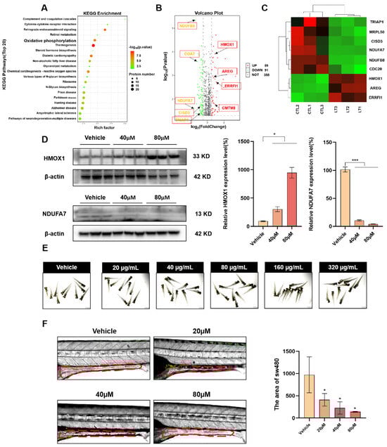The zebrafish xenograft tumor model and proteomics results. (A) Proteomic KEGG enrichment analysis showed the top 20 KEGG pathways after treatment of OMe-Ph-Elemene. (B) The proteomic volcano map illustrates the alteration in protein levels following treatment with OMe-Ph-Elemene. The color red indicates an increase, while gold signifies a decrease. (C) The proteomic heat map showed that OMe-Ph-Elemene down-regulated the expression of proteins related to oxidative phosphorylation, such as NDUFA7 and NDUFB8, and up-regulated the expression of proteins related to oxidative stress and apoptosis, such as HMOX1, CISD3, and TRIAP1. (D) The Western blot analysis revealed a dose-dependent increase in the protein level of HMOX1, while a corresponding decrease was observed in the protein level of NDUFA7. * p < 0.05, *** p < 0.001. (E) The in vivo toxicity of OMe-Ph-Elemene was tested by statistical analysis of the malformation rate and mortality of zebrafish. The results showed that zebrafish below 320 µg/mL did not show deformities and death, indicating that OMe-Ph-Elemene was not significantly toxic at this concentration. (F) After the zebrafish transplanted tumor was treated with OMe-Ph-Elemene, the transfer of sw480 cells into the intestines of Zebrafish was observed under a confocal microscope, and the statistics were performed. * p < 0.05. The red dotted line is the intestinal tract of zebrafish. The vehicle groups represent solvent groups (DMSO).
