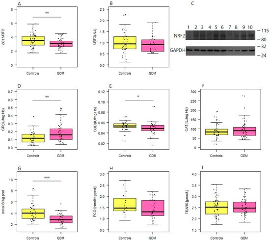 Differences in the redox status-related parameters between controls and GDM patients. (A) Relative expression of NFE2L2 (encoding NRF2) in GDM vs. normoglycemic controls, presented as ΔCt values on the y-axis; (B) levels of the NRF2 protein in the GDM group and controls (C) with the representative immunoblot of samples belonging to GDM group (odd numbers) and controls (even numbers) paired according to the concentration of isolated proteins (on the right), demonstrating the lack of obvious differences in the expression of NRF2 between groups; specific activities of (D) GR, (E) SOD and (F) CAT in GDM patients and controls; (G) serum thiol, (H) PCO and (I) TBARS concentration in GDM patients and controls. Boxes represent medians with interquartile ranges, while whiskers indicate min and max values; statistical significance was analyzed by Student’s t-tests; p < 0.05 is indicated by an asterisk, p < 0.01 by two asterisks and p < 0.001 by three asterisks.