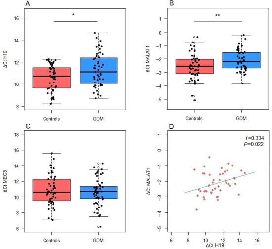 Differences in the expression levels of lncRNAs between GDM patients and controls: (A) H19, (B) MALAT1 and (C) MEG3. (D) Correlation between the expression of MALAT1 and H19. Boxes represent medians with interquartile ranges, while whiskers indicate min and max values; statistical significance was analyzed by Student’s t-tests; p < 0.05 is indicated by an asterisk and p < 0.01 by two asterisks. Pearson’s correlation coefficient ® and the corresponding p value from the linear regression analysis are presented within the scatter plot.