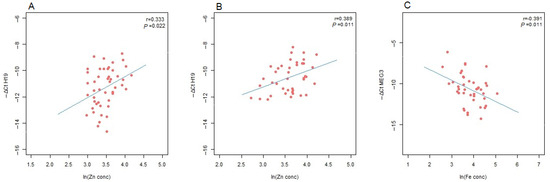 Correlations between the expression levels of lncRNAs and the logarithmically transformed values of metal ion concentrations: (A) H19 and zinc in GDM patients; (B) H19 and zinc in controls; (C) MEG3 and iron in GDM patients. Pearson’s correlation coefficient (r) and the corresponding p value from the linear regression analysis are presented within the scatter plot.