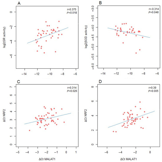 Correlations between the expression levels of lncRNAs (ΔCt) and the logarithmically transformed values of redox status parameters: (A) H19 and GR activity; (B) H19 and SOD activity; (C) MALAT1 and NFE2L2 mRNA expression in GDM patients; (D) MALAT1 and NFE2L2 mRNA expression in controls. Pearson’s correlation coefficient (r) and the corresponding p value from the linear regression analysis are presented within the scatter plot.