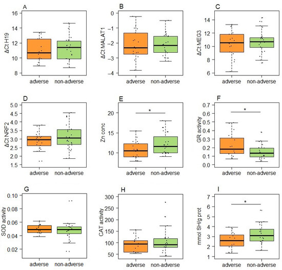 The expression of lncRNAs and redox status parameters in GDM patients stratified according to pregnancy outcomes: (A) H19; (B) MALAT1; (C) MEG3; (D) NFE2L2 mRNA; (E) zinc concentration; (F) GR activity; (G) SOD activity; (H) CAT activity; (I) serum thiol content. Boxes represent medians with interquartile ranges, while whiskers indicate min and max values; statistically significant difference between two subgroups was analyzed by Student’s t-tests; p < 0.05 is indicated by an asterisk.
