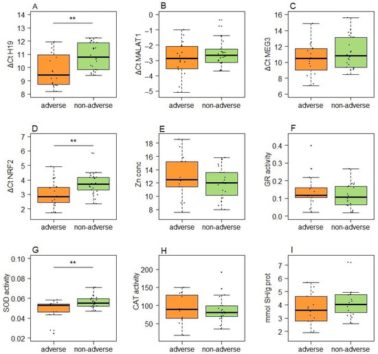 The expression of lncRNAs and redox status parameters in controls stratified according to pregnancy outcomes: (A) H19; (B) MALAT1; (C) MEG3; (D) NFE2L2 mRNA; (E) zinc concentration; (F) GR activity; (G) SOD activity; (H) CAT activity; (I) serum thiol content. Boxes represent medians with interquartile ranges, while whiskers indicate min and max values; statistically significant difference between two subgroups was analyzed by Student’s t-tests; p < 0.01 is indicated by two asterisks.