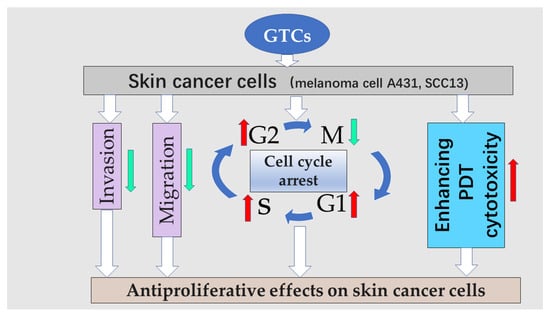 Antiproliferative effects on skin cancer cells. Red arrows indicate increases, and green arrows indicated decreases.