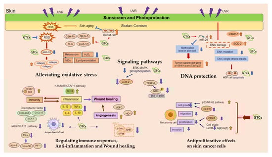 The strong antioxidant activity of GTCs effectively protects the skin against solar UVR-induced damage, with their functions primarily attributed to total GTCs and certain monomers, notably with EGCG as the most potent component. Both oral administration and topical application of GTCs have been investigated for their photoprotective effects.