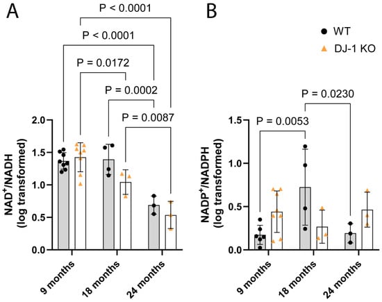 3.3. DJ-1 Knockout Accelerates Age-Dependent Decrease in Skeletal Muscle NAD+/NADH Ratio