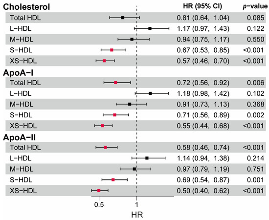 To examine the associations between HDL subclass parameters and mortality risk in CKD, we conducted univariable Cox regression analyses on the evaluated HDL subclass parameters (Figure 2). Notably, parameters of the S- and XS-HDL subclasses demonstrated a strong inverse association with mortality risk, with XS-HDL-ApoA-II exhibiting the most significant association (HR 0.50 per 1 SD increase, 95% CI 0.40, 0.62, p < 0.001). Total HDL-ApoA-I and HDL-ApoA-II levels were also inversely associated with the risk of all-cause mortality.